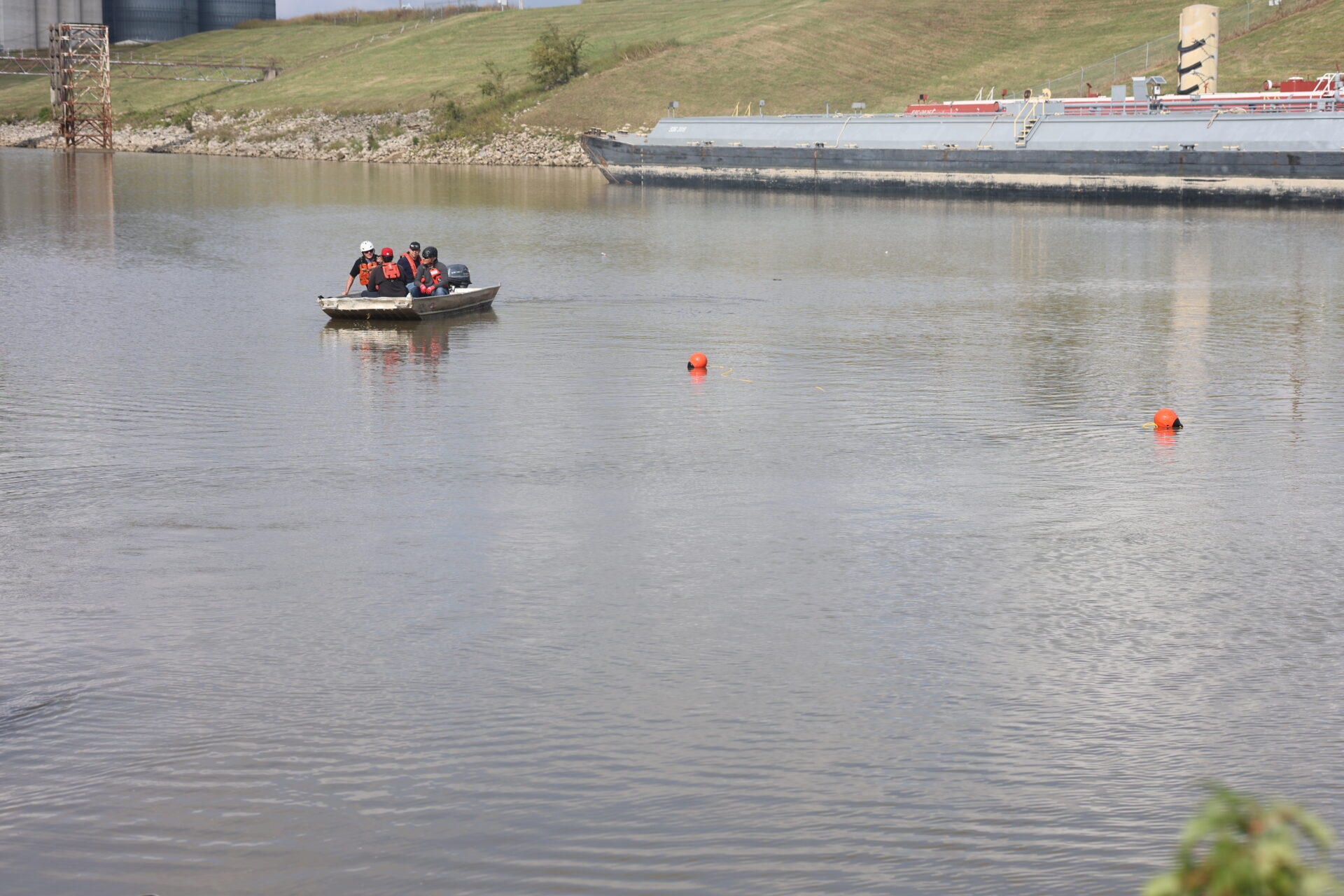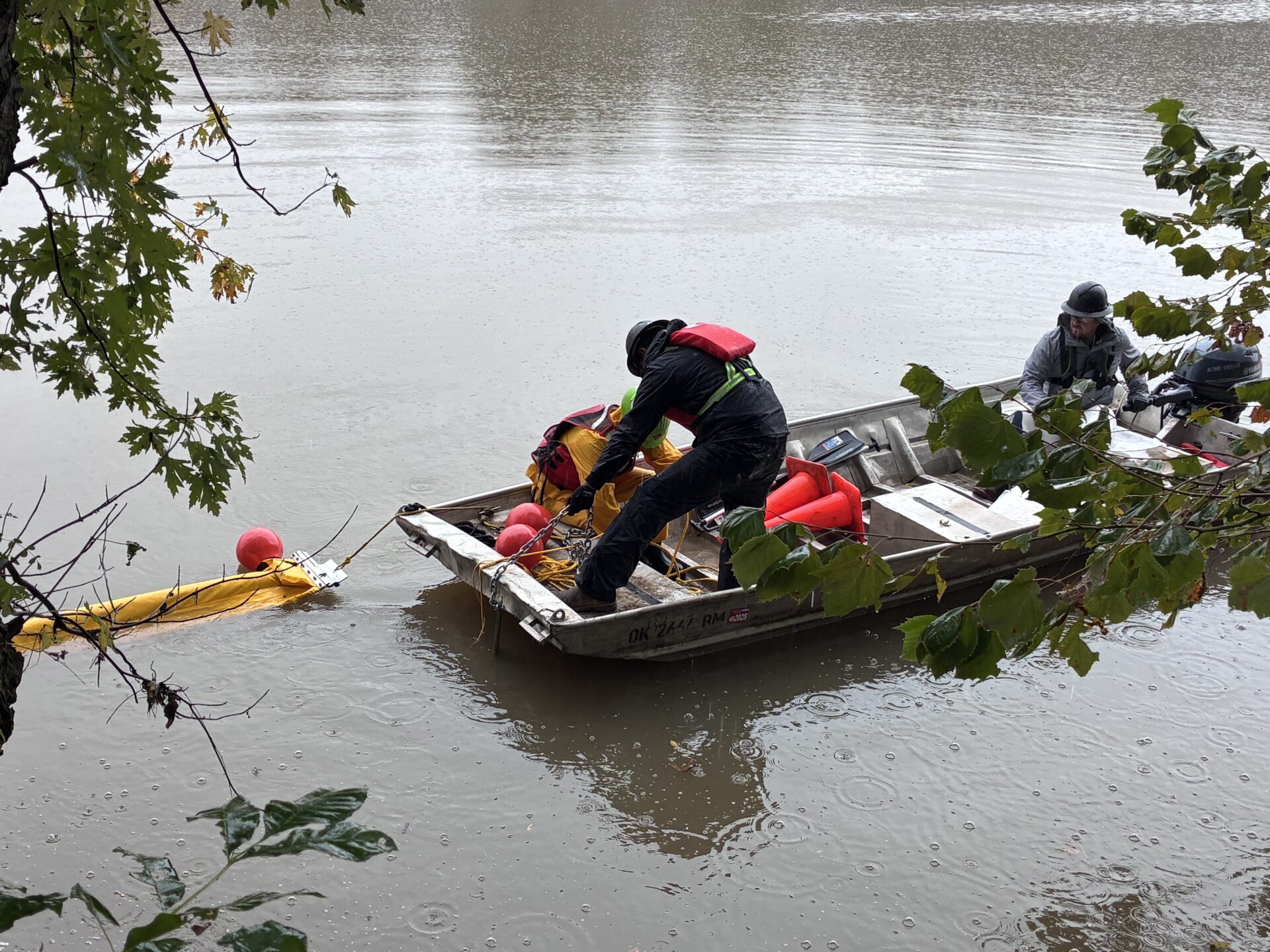 Training ramped up on Day Two at Port 33 along the Verdigris River, where participants took on the implementation of the cascading boom deployment method in moving water. This method is a vital skill for containing oil in fast-moving water, requiring careful coordination, accuracy, and teamwork to ensure the containment boom holds its position against currents.